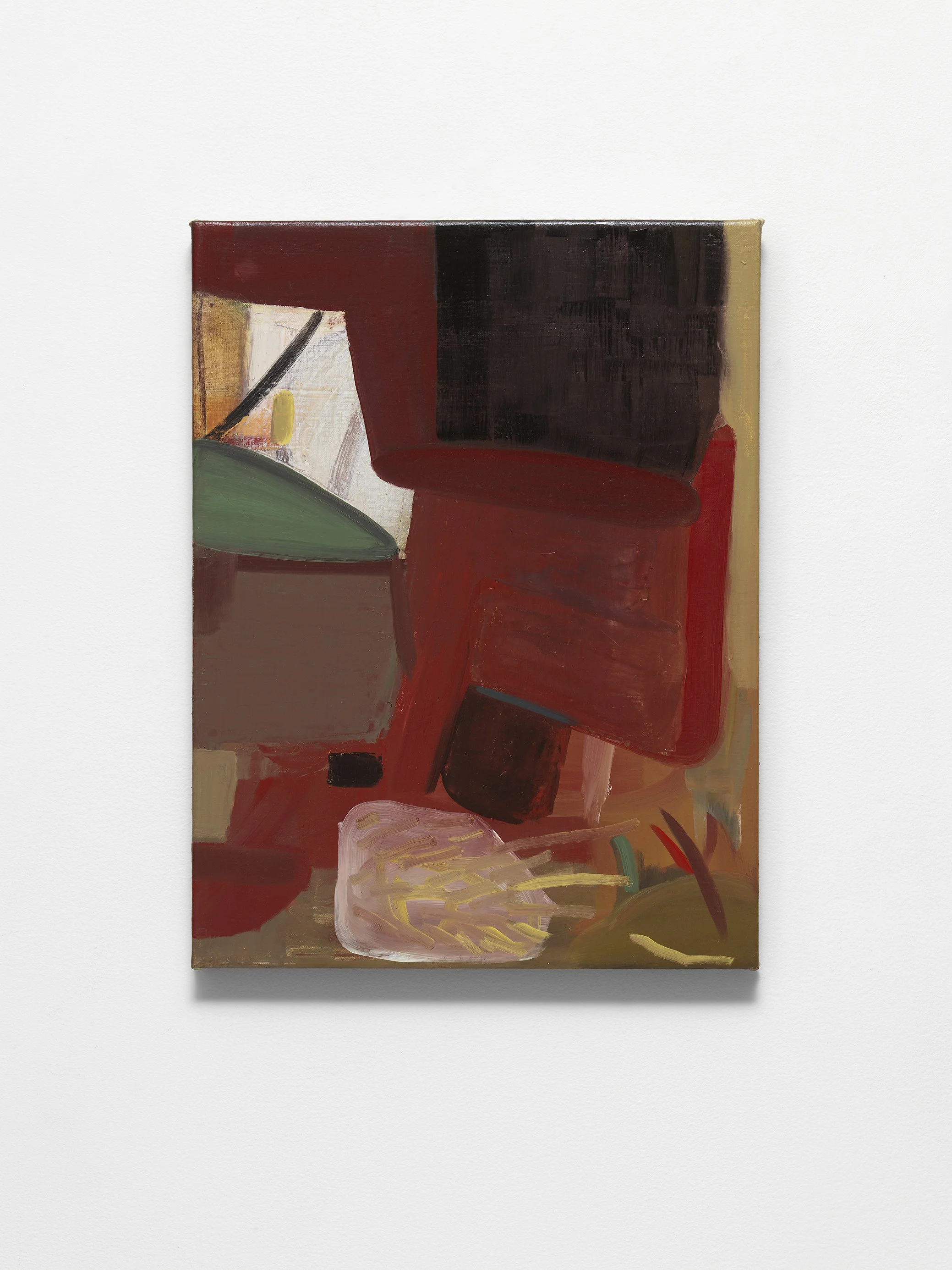 Vicente Matte’s paintings maintain their references while concentrating on their formal and psychological properties. The figure is preserved even as, in the artist’s words, he “allows the forms to go as far as possible in the search of an inexplicable adaptation.” His painting Great Conjunction depicts an astronomical event of the same name between Jupiter and Saturn that he witnessed from his home in Santiago, Chile. This abstract landscape collapses vast distances and scales into distinct geometric shapes and cross layers as a group of figures huddles in the lower left register. Pushing the forms even further, his two Untitled paintings in this exhibition retain traces of the human face despite being refined into geometry. Matte’s search for meaning exposes a precarious balance between shape and context.
